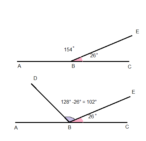 Из вершины развернутого угла ABC (см.рис.) проведены два луча BD и BE так, что < ABE=154°, < DBC=128°.вычислите градусную меру угла DBE.