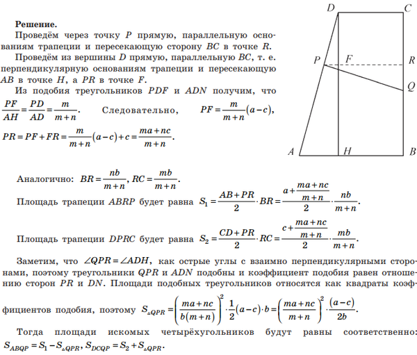 В прямоугольной трапеции ABCD с основаниями AB и CD, равными соответственно а и c, c < а, боковая сторона BC перпендикулярна основаниям и равна b. Из точки P стороны AD, делящей её так, что AP : PD = n : m, n > = m, к этой стороне проведён перпендикуляр, пересекающий сторону BC в точке Q. Найдите площадь четырёхугольника APQB, PQCD