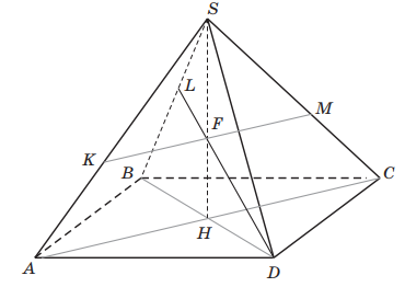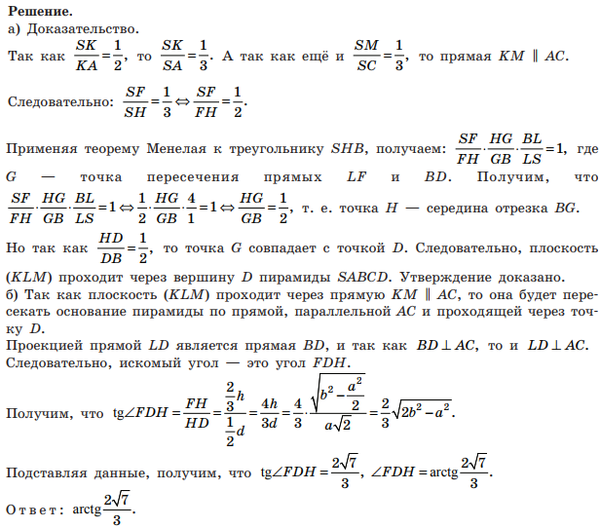 Точки K, L, M расположены на ребрах SA, SB, SC правильной четырехугольной пирамиды SABCD соответственно, и при этом SK/KA = 1/2; SL/SB = 1/5; SM/SC = 1/3 а) Докажите, что плоскость (KLM) проходит через вершину D пирамиды SABCD. б) Найдите угол между плоскостью (KLM) и плоскостью основания пирамиды (ABCD), если SA = b = 2, AB = a = 1.