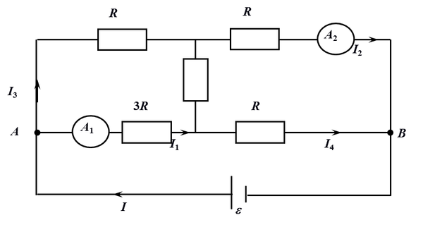 На рисунке приведена схема с включенными в неё идеальными амперметрами. Показания первого считать известными (ток I1). Чему равен ток через второй амперметр А2? Внутренним сопротивлением ЭДС пренебречь.