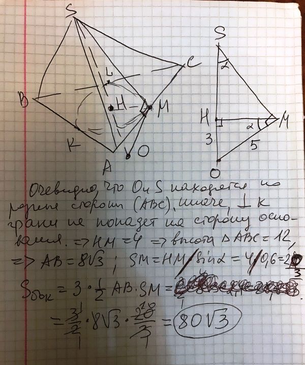 Сфера радиусом R = 5 касается боковых граней правильной треугольной пирамиды SABC в точках K, L, M, принадлежащих сторонам основания пирамиды. Найдите площадь боковой поверхности пирамиды, если центр сферы удалён от плоскости её основания на расстояние, равное d = 3.