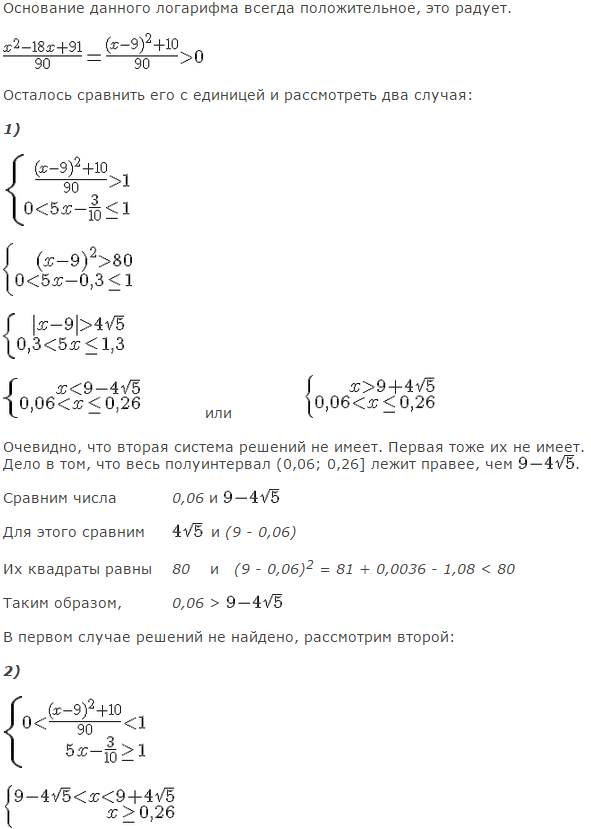 Решить неравенство log((x^2-18x+91)/90)(5x-3/10) меньше или равно 0
