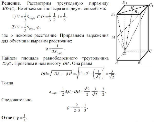 В правильной четырехугольной призме АВCDA1B1C1D1 сторона основания равна 1 а высота равна 2. М середина ребра AA1. Найдите расстояния от точки M до плоскости DA1C1