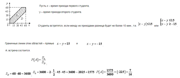 Два человека договорились встретиться между 15 и 16 часами с условием, что тот, кто придёт первым, ожидает второго не более 15 минут. Найдите вероятность того, что они встретятся.