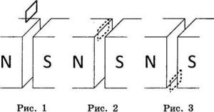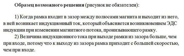Маленькая замкнутая рамка из медного провода падает из состояния покоя (см. рисунок 1), попадая по пути в зазор между полюсами постоянного магнита. Когда рамка входит в зазор и выходит из него, в ней возникает электрический ток. В каком из случаев (изображенных на рисунках 2 и 3) модуль силы тока в рамке имеет большее значение? Ответ поясните, указав, какие физические явления и закономерности вы использовали для объяснения.