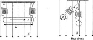 По прямому горизонтальному проводнику длиной 1 м с площадью поперечного сечения 1,25 • 10^(-5) м^2, подвешенному с помощью двух одинаковых невесомых пружинок жесткостью 100 Н/м, течет ток I = 10 А (см. рисунок). Какой угол а составляют оси пружинок с вертикалью при включении вертикального магнитного поля с индукцией В = 0,1 Тл, если абсолютное удлинение каждой из пружинок при этом составляет 7 • 10^(-3) м? (Плотность материала проводника — 8 • 10^3 кг/м3.)