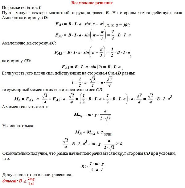 На непроводящей горизонтальной поверхности стола лежит проводящая жёсткая рамка из однородной тонкой проволоки, согнутой в виде равностороннего треугольника ADС со стороной, равной a (см. рисунок). Рамка, по которой течет ток I, находится в однородном горизонтальном магнитном поле, вектор индукции которого B перпендикулярен стороне CD. Каким должен быть модуль индукции магнитного поля, чтобы рамка начала поворачиваться вокруг стороны CD, если масса рамки m?