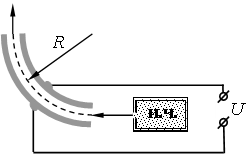 На рисунке показана схема устройства для предварительного отбора заряженных частиц с целью последующего детального исследования. Устройство представляет собой конденсатор, пластины которого изогнуты дугой радиуса R ≈ 50 см. Предположим, что в промежуток между обкладками конденсатора из источника заряженных частиц (и. ч.) влетают, как показано на рисунке, ионы с зарядом е. Напряжённость электрического поля в конденсаторе по модулю равна 50 кВ/м. При каком значении кинетической энергии ионы пролетят сквозь конденсатор, не коснувшись его пластин? Считать, что расстояние между обкладками конденсатора мало, напряжённость электрического поля в конденсаторе всюду одинакова по модулю, а вне конденсатора электрическое поле отсутствует. Влиянием силы тяжести пренебречь.
