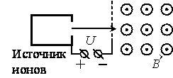 Ион ускоряется в электрическом поле с разностью потенциалов U = 10 кВ и попадает в однородное магнитное поле перпендикулярно к вектору его индукции B (см. рисунок). Радиус траектории движения иона в магнитном поле R = 0,2 м, отношение массы иона к его электрическому заряду m/q = 5•10^(–7) кг/Кл. Определите значение модуля индукции магнитного поля. Кинетической энергией иона при его вылете из источника пренебрегите.