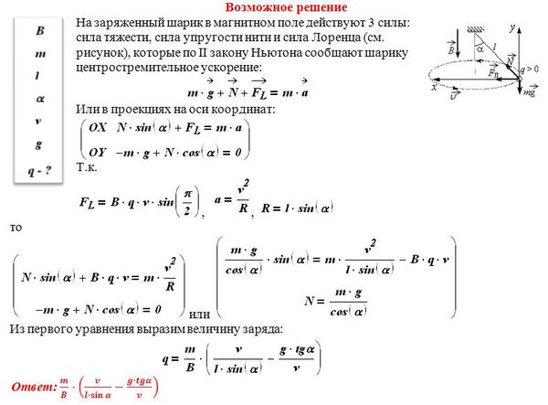 В однородном магнитном поле с индукцией В, направленной вертикально вниз, равномерно вращается в горизонтальной плоскости против часовой стрелки положительно заряженный шарик массой m, подвешенный на нити длиной l (конический маятник). Угол отклонения нити от вертикали равен α, скорость движения шарика равна v. Найдите заряд шарика q.