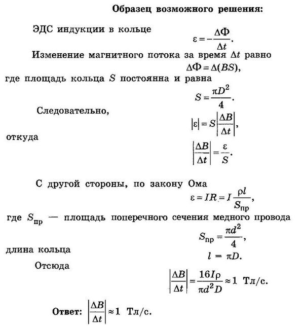Медное кольцо, диаметр которого — 20 см, а диаметр провода кольца 2 мм, расположено в однородном магнитном поле. Плоскость кольца перпендикулярна вектору магнитной индукции. Определите модуль скорости изменения магнитной индукции поля со временем, если при этом в кольце возникает индукционный ток 10 А. Удельное сопротивление меди ρСu = 1,72 • 10^(-8) Ом·м.