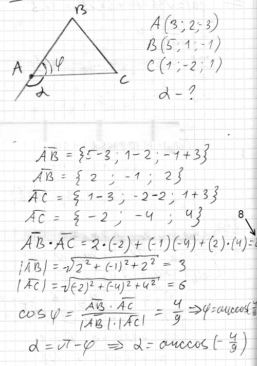 Даны вершины треугольника A(3; 2; -3), B(5; 1; -1), C(1; -2; 1). Определить его внешний угол при вершине А.