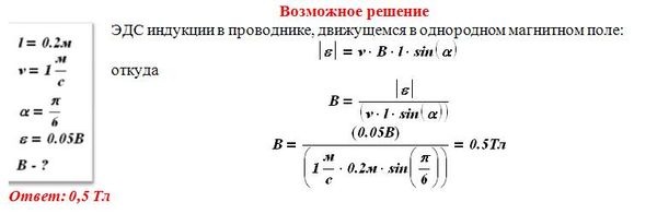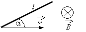Проводящий стержень длиной l = 20 см движется поступательно в однородном магнитном поле со скоростью v = 1 м/с так, что угол между стержнем и вектором скорости α = 30° (см. рисунок). ЭДС индукции в стержне равна 0,05 В. Какова индукция магнитного поля?