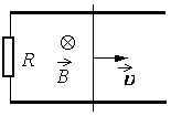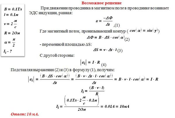 Прямоугольный контур, образованный двумя рельсами и двумя перемычками, находится в однородном магнитном поле, перпендикулярном плоскости контура. Правая перемычка скользит по рельсам, сохраняя надежный контакт с ними. Известны величины: индукция магнитного поля В = 0,1 Tл, расстояние между рельсами l = 10 см, скорость движения перемычки v = 2 м/c, сопротивление контура R = 2 Ом. Какова сила индукционного тока в контуре? Ответ выразите в миллиамперах (мА)