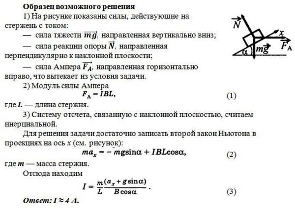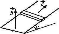 Горизонтальный проводящий стержень прямоугольного сечения поступательно движется с ускорением вверх по гладкой наклонной плоскости в вертикальном однородном магнитном поле (см. рисунок). По стержню протекает ток I. Угол наклона плоскости α = 30°. Отношение массы стержня к его длине m/l = 0,1 кг/м. Модуль индукции магнитного поля В = 0,2Тл. Ускорение стержня a = 1,9 м/с^2. Чему равна сила тока в стержне?