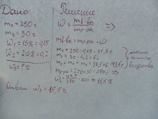Смешали 250 г раствора поваренной соли с массовой долей 15% и 30 г раствора с массовой долей 20%. Определите массовую долю соли в полученном растворе. Ответ в % (запишите число с точностью до десятых).
