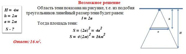 К потолку комнаты высотой 4 м прикреплена лампа накаливания. На высоте 2 м от пола параллельно ему расположен непрозрачный квадрат со стороной 2 м. Центр лампы и центр квадрата лежат на одной вертикали. Найдите площадь тени квадрата на полу.
