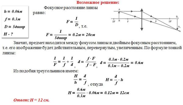 Предмет высотой 6 см расположен на главной оптической оси тонкой собирающей линзы на расстоянии 30 см от ее оптического центра. Оптическая сила линзы 5 дптр. Найдите высоту изображения предмета. Ответ выразите в сантиметрах (см).