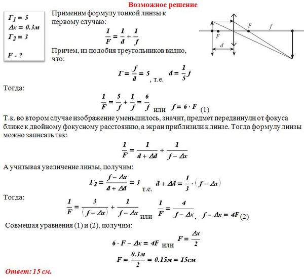 На экране с помощью тонкой линзы получено изображение стержня с пятикратным увеличением. Стержень расположен перпендикулярно главной оптической оси, и плоскость экрана также перпендикулярна этой оси. Экран передвинули на 30 см вдоль главной оптической оси линзы. Затем, при неизменном положении линзы, передвинули стержень так, чтобы изображение снова стало резким. В этом случае получено изображение с трехкратным увеличением. Определите фокусное расстояние линзы.