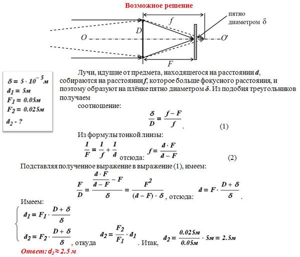 Объективы современных фотоаппаратов имеют переменное фокусное расстояние. При изменении фокусного расстояния «наводка на резкость» не сбивается. Условимся считать изображение на плёнке фотоаппарата резким, если вместо идеального изображения в виде точки на плёнке получается изображение пятна диаметром не более 0,05 мм. Поэтому если объектив находится на фокусном расстоянии от плёнки, то резкими считаются не только бесконечно удалённые предметы, но и все предметы, находящиеся дальше некоторого расстояния d. Оказалось, что это расстояние равно 5 м, если фокусное расстояние объектива 50 мм. Как изменится это расстояние, если, не меняя «относительного отверстия» изменить фокусное расстояние объектива до 25 мм? («Относительное отверстие» – это отношение фокусного расстояния к диаметру входного отверстия объектива.) При расчётах считать объектив тонкой линзой. Сделайте рисунок, поясняющий образование пятна.