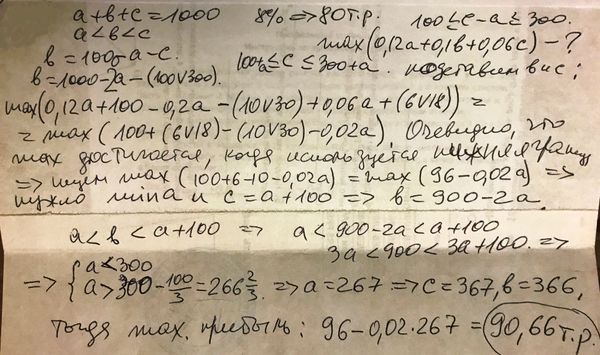 вкладчик решил разместить в банке 1000 тысяч рублей на 1 год. банк предлагает две стратегии:первая- начислить 8%годовых, если вклад целиком. либо предлагает разбить вклад на 3 части. тогда на меньшую будет начислено12%, на среднюю-10;, на большую-6% годовых. какую наибольшую прибыль может получить вкладчикю. если большая часть должна отличаться от меньшей части не менее чем на 100 тысяч рублей но не более чем на 300 тысяч рублей