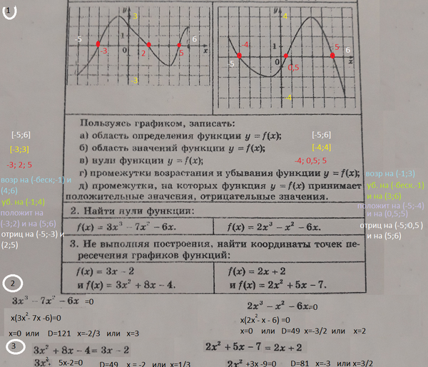 д) промежутки, на которых функция у = f(x) принимает положительные значения, отрицательные значения.
