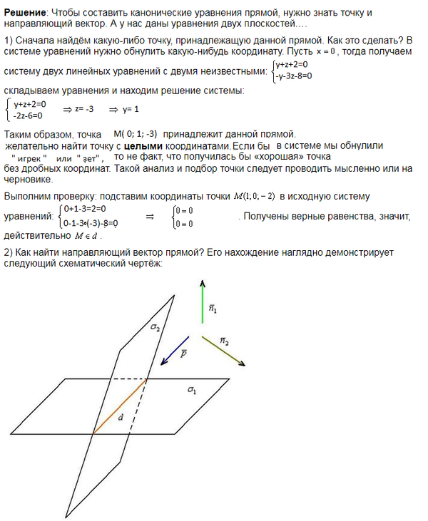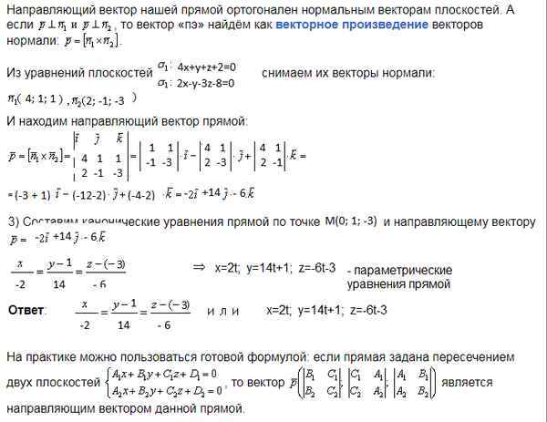 2. Из общих уравнений прямой получить их канонические и параметрические уравнения: system{4x+y+z+2=0; 2x-y-3z-8=0}