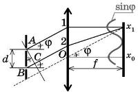 На дифракционную решетку с периодом d = 0,01 мм нормально к поверхности решетки падает параллельный пучок монохроматического света с длиной волны l = 600 нм. За решеткой, параллельно ее плоскости, расположена тонкая собирающая линза с фокусным расстоянием f = 5 см. Чему равно расстояние между максимумами первого и второго порядков на экране, расположенном в фокальной плоскости линзы