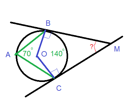 О т в е т. ∠BMC= 360 градусов - 140 градусов - 90 градусов - 90 градусов = 40 градусов.