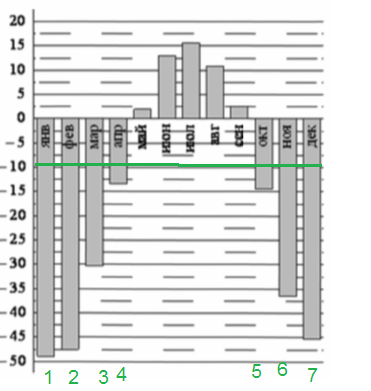 На диаграмме показана среднемесячная температура воздуха (в градусах Цельсия) в Верхоянске по результатам многолетних наблюдений. Найдите по диаграмме количество месяцев, когда среднемесячная температура в Верхоянске ниже - 10° С