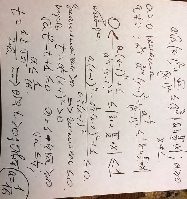 Найдите наибольшее значение параметра а, при котором неравенство asqrt(a)(x^2-2x+1)+sqrt(a)/(x^2-2x+1) меньше или равно корень_4_степени_из(a^3) |sin(Pi/2)x| имеет хотя бы одно решение.