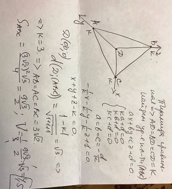 Длина высоты правильной треугольной пирамиды равна sqrt(3), а все плоские углы при вершине пирамиды — прямые. Найдите объём пирамиды.