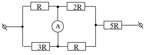 Определите силу тока через резистор 5R, если амперметр показывает 10 А. Ответ дать в амперах. Амперметр считать идеальным.