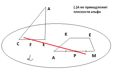 3) треугольник АСЕ полностью вне плоскости альфа, но прямая PF пересекает сторону АС в точке К.(рис.2а). То есть три точки К,F,P лежат на одной прямой, не принадлежащей плоскости альфа, она ее пересекает в точке P.В этом случае прямые АС и PF пересекаются в точке К.
