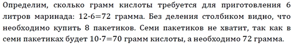 Для приготовления маринада для огурцов на 1 литр воды требуется 12 г лимонной кислоты. Лимонная кислота продаётся в пакетиках по 10 г. Какое наименьшее число пачек нужно купить хозяйке для приготовления 6 литров маринада?