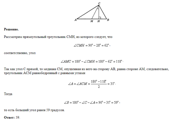 В прямоугольгот треугольнике угол между высотой и медианой проведенным из вершин прямого угла равен 28 градусов. найдите больший из острых углов этого треугольника