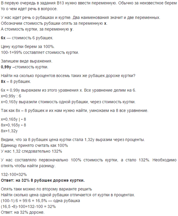 Шесть одинаковых рубашек дешевле куртки на 1%. На сколько процентов восемь таких же рубашек дороже куртки?