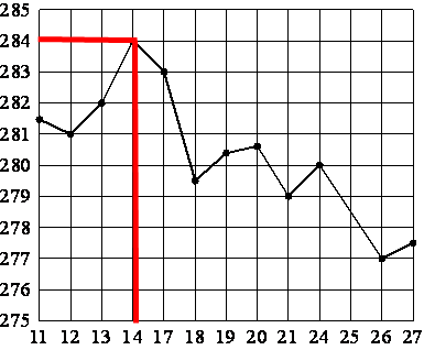 На рисунке жирными точками показана цена унции золота на момент закрытия биржевых торгов во все рабочие дни с 11 по 27 июля 2000 года. По горизонтали указываются числа месяца, по вертикали – цена унции золота в долларах США. Для наглядности жирные точки на рисунке соединены линией. Определите по рисунку, какого числа цена унции золота на момент закрытия торгов была наибольшей за указанный период.