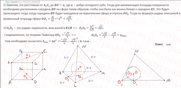 В правильный тетраэдр KLMN с ребром 3sqrt(7) вписана сфера Ω . Куб ABCDA1B1C1D1 расположен так, что его диагональ А1С1 лежит на прямой KL, а прямая BD касается сферы Ω в точке, лежащей на отрезке BD Какую наименьшую площадь поверхности может иметь куб ABCDA1B1C1D1? Ответ округлите до десятых.