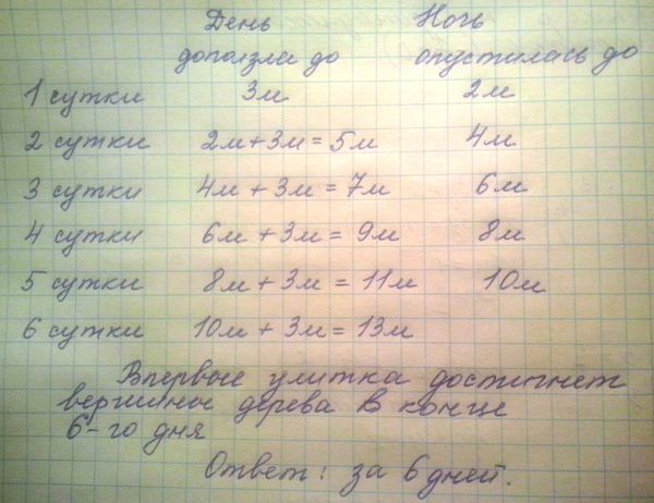 Таким образом за сутки она продвигается вверх на 2 м. За 5 суток она поднимется на 10 м. На 6-й день она достигнет вершины дерева.