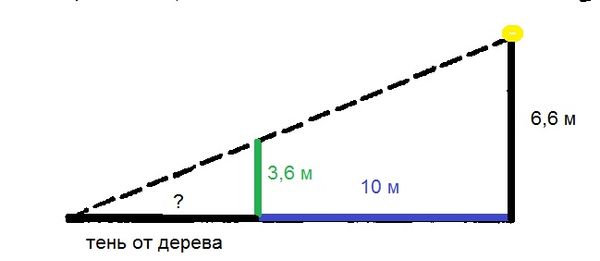тополь высотой 3,6 м растет на расстоянии 10 м от столба на котором висит фонарь на высоте 6,6 м. Найдите длину тени тополя в метрах.