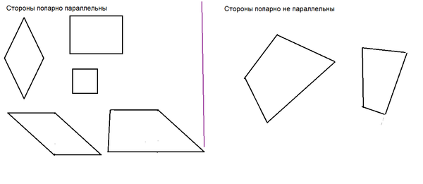 Наверное, на те, у которых стороны попарно параллельны и те, у которых стороны не параллельны.