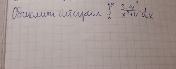 Выделяем целую часть 3- x^2= (-x^2-4)+7 (3- x^2)/(x^2+4)= ((-x^2-4)+7)/(x^2+4)=-1 + (7/(x^2+4)) ∫ (-1 + (7/(x^2+4)))dx=-x + 7arctg(x/2) lim_(x→∞)(-x)= бесконечность Интеграл расходится