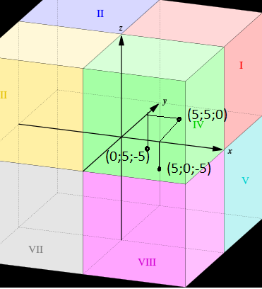 В пятом октанте х > 0; у > 0; z < 0 Так как шар касается всех трех координатных плоскостей, значит ему принадлежат точки (5,5,0) (5,0,-5) (0,5,-5) Координаты центра (5,5,-5).