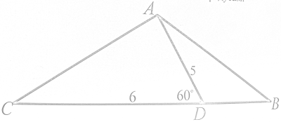 В треугольнике АВС на стороне BС=9 взята точка D, так, что CD = 6, AD = 5. Найдите АВ, если известно, что угол ADC равен 60 градусам
