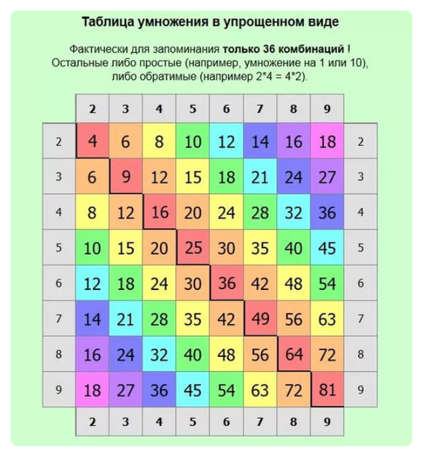 Например, сколько будет 9×6? Сразу понимаем, что ответ будет начинаться на цифру 5 (на один меньше, чем 6). Вторая цифра: 9-5=4 (потому что сумма чисел 4+5=9). Получается 54!