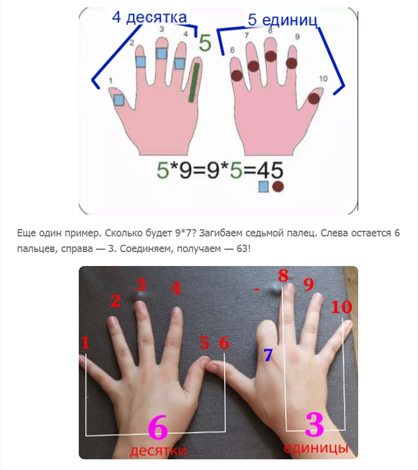 Еще один пример. Сколько будет 9*7? Загибаем седьмой палец. Слева остается 6 пальцев, справа — 3. Соединяем, получаем — 63!