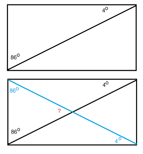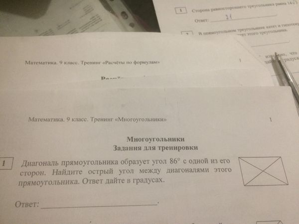 Диагональ прямоугольника образует угол 86° с одной из его сторон. Найдите острый угол между диагоналями этого прямоугольника. Ответ дайте в градусах.