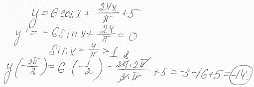 Найдите наименьшее значение функции y=6cosx+24x/П+5 на отрезке [-2П/3; 0].