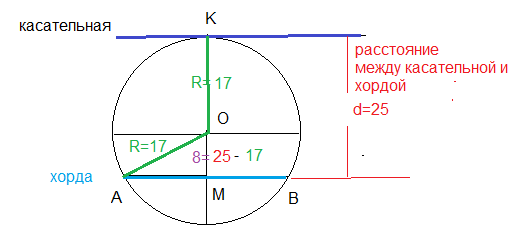 Продолжим радиус ОК за точку О, получаем диаметр.